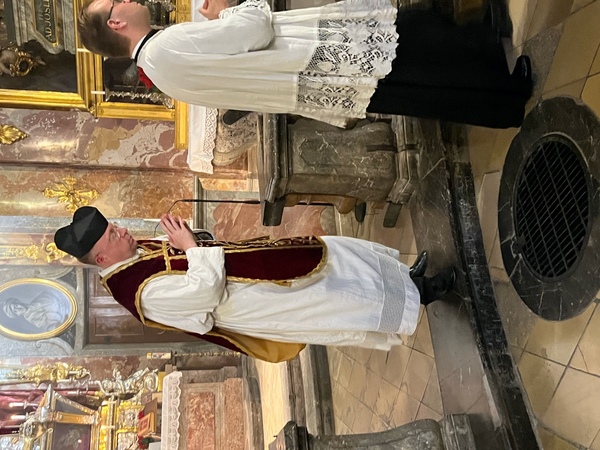 Die barocke Asamkirche in der Sendlinger Straße, ein barockes Juwel und eine der schönsten Kirchen Münchens bot den rechten Ort für die geistliche Einstimmung, in den Herr Dr. Markus Christopher Müller (Ludwig-Maximilian-Universität München) zu Beginn kurz einführte. P. Dr. Georg Fischer OT, in Frankfurt unter anderem durch SE Bischöf Bätzing mit der Pflege des usus antiquior des römischen Ritus betraut, feierte ein gesungenes Amt zum Gedenktag des Hl. Apostels Paulus. In seiner Predigt ging er darauf ein, daß Gott einen jeden von uns Familiaren eigens beruft und daß diese Berufung stets Dienst an den Menschen ist, nicht Schmuck oder Belohnung, auf der man sich ausruhen könnte. So wie die Bürger vor Akkon und später die Ritter des Deutschen Ordens ihr Kreuz täglich selbstlos auf sich nahmen, um den Menschen zu helfen, so besteht derselbe Auftrag im Grunde bis heute fort. Die Feier im usus antiquior, der in seiner Zeitlosigkeit seit über 1500 Jahren im wesentlichen unverändert blieb, kann auf diese Weise eine ständige Brücke schlagen und „Gleichzeitigkeit“ zu den Ursprüngen des Deutschen Ordens 1190 vor Akkon herstellen. Die Festlichkeit des Ortes, der Liturgie, des Orgelspiels (W. Eisen) und des Gesangs der Sängerinnen (E. Müller, R. Nikoleiski, M. Steinschulte) führten alle über zwanzig mitfeiernde Familiaren und Gäste dem himmlischen Jerusalem näher.