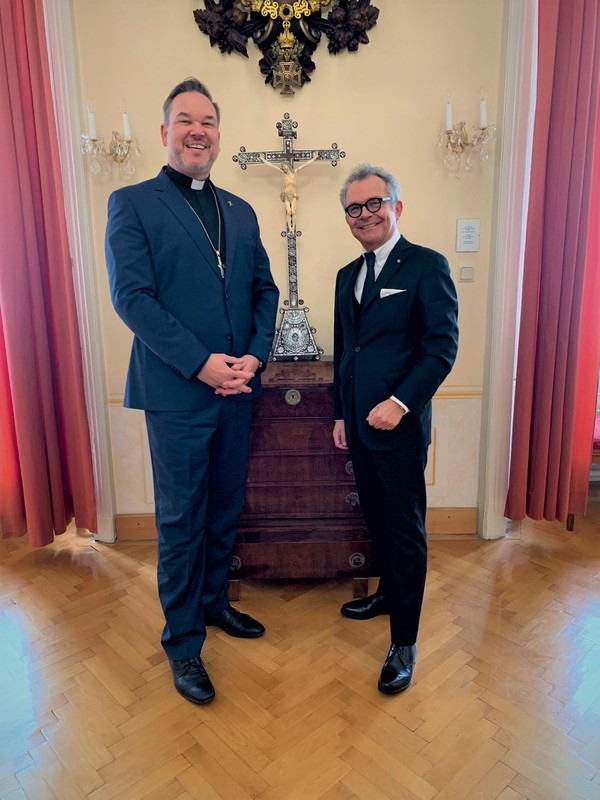 Am 21. Oktober 2022 weilte der Balleimeister der Ballei Deutschland, Thomas Jünger, in Wien, um Hochmeister Frank für einen Antrittsbesuch die Aufwartung zu machen. Er überbrachte auch die Grüße der im Sommer neu gewählten Balleileitung. Im Hochmeisteramt tauschten sich Hochmeister und Balleimeister insbesondere über die Stellung der Familiaren im Deutschen Orden und deren Selbstverständnis sowie ihre Rolle in der Zukunft aus. Hiermit wird sich der Generalrat im Rahmen des Strukturprojekts "Deutscher Orden 2030" ebenfalls befassen. Das Treffen gab Gelegenheit, Hochmeister Frank die geplanten Aktivitäten der Ballei Deutschland im nächsten Jahr wie die Wallfahrt nach Maria Birnbaum Anfang Juni 2023 sowie die Reise "Auf den Spuren des Deutschen Ordens in Polen" Mitte August 2023 vorzustellen. Auch das vom neuen Geistlichen Assistenten gewählte Thema "Deus lo vult" – "Gott will es" wurde beleuchtet und eine regelmäßige Videokonferenz der Balleimeister ordensweit ins Auge gefasst. Weiteres konnte nach der Sext beim Mittagstisch im Refektorium beraten werden. Beim Auseinandergehen wurde Hochmeister Frank für sein Wohlwollen und die häufigen Besuche der Familiaren in Deutschland mit einem Vergelts Gott gedankt.