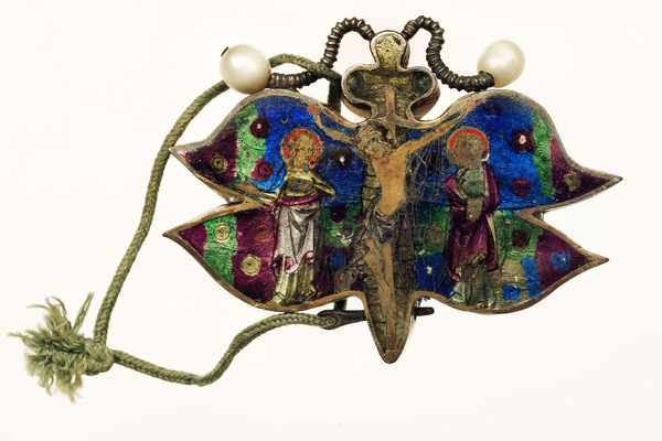 Bei der Restaurierung eines gotischen Kruzifixes aus dem ehemaligen Schottenkloster in Regensburg wurde im April 1991 eine erstaunliche Entdeckung gemacht. Im Hinterkopf der Figur des Gekreuzigten fand man in einem Hohlraum ein Reliquiar in Schmetterlingsform mit Kreuzpartikel. Es ist eine feuervergoldete Emailarbeit aus Silber, dargestellt sind Jesus, Maria und Johannes. Das gesamte Kunstwerk ist nicht größer als 3 mal 5 cm. Die Fühler des Schmetterlings sind dargestellt mit kleinen Perlen. Als Entstehungszeit des kostbaren Fundes nimmt man die Zeit um 1310/1320 an. Schon im Altertum und in der Zeit der frühen Christen war der Schmetterling Sinnbild der Verwandlung vom Tod zum Leben.
