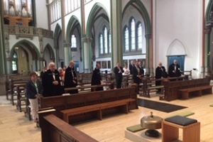 Auch unsere Komturei litt unter dem Coronavirus, indem manche Begegnung und liturgische Feier nicht durchgeführt werden konnte. Um so wichtiger war es uns, das Titelfest Kreuzerhöhung gemeinsam zu feiern. Die Heilig-Kreuz-Kirche in Münster bot sich an, da die Geräumigkeit der Kirche und die Neupositionierung der Bänke der Vorsicht und dem Sicherheitsbedürfnis jedes Einzelnen Rechnung trug. Zudem hat die Kirche für die Münsteraner eine besondere Bedeutung, weil hier – der Dom war aufgrund der Bombardierungen der Altstadt zerstört – Bischof Clemens August Graf von Galen am 17. März 1946, fünf Tage vor seinem überraschenden Tod, das erste und einzige Pontifikalamt nach seiner Erhebung zum Kardinal und seiner Rückkehr aus Rom gehalten hat.