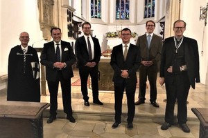 Bad Mergentheim/ Würzburg. Nachdem die diesjährige Investitur in Münster wegen der Corona-Pandemie abgesagt werden musste, war dies der Auftakt für eine Ersatzveranstaltung. Was lag da für vier Neufamiliaren des "Jahrgangs 2019" näher als sich auf die historischen Spuren des Ordens zu begeben und das "Einjährige" gebührend zu begehen. Planung und Organisation übernahm Confrater Diakon Dr. Stefan Wick (Kassel), wozu natürlich auch die Kontaktaufnahme zu den Komturen vor Ort gehörte. Mit ihm versammelten sich die Confratres Bertram Alda (Köln) Thomas Arnold (Frankfurt a.M.) und Andreas Geyr (Düsseldorf). Ausgangspunkt der Exkursion sollte Bad Mergentheim sein.