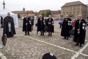 Die traditionelle Würzburger Fronleichnamsprozession durch Würzburg fiel aufgrund der im Freistaat Bayern geltenden Sicherheitsbestimmungen aufgrund der Corona-Pandemie aus. „Wir feiern die heilige Messe auf dem schönen Platz vor der Residenz, wo wir all dem ausgesetzt sind, Regen und Stürmen, was uns in der Welt widerfahren kann“, begrüßte Weihbischof Ulrich Boom, ein regenerprobter Westfale aus dem Münsterland – der Landstrich, in dem der Dauerregen erfunden wurde wie Legat Fabio Chigi (späterer Papst Alexander der VII.) anläßlich der Verhandlungen zum westf. Frieden bemerkte - die Gläubigen. Darunter die Vertreter der Komturei Franken des Deutschen Ordens, die Malteser- und Grabesritter sowie die Fahnenabordnungen der katholischen Studentenverbindungen. Weihbischof Boom zelebrierte den Fronleichnamsgottesdienst in Vertretung von S.E. Bischof Dr. Franz Jung, der aufgrund eines chirurgischen Eingriffs verhindert war. Conzelebranten waren S.E. Bischof em. Dr. Friedhelm Hofmann (SMOM) und Domdekan Dr. Jürgen Vorndran (OESSH).