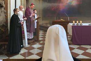 Den Beginn der Quadragesima zur Vorbereitung auf die Feier des Todes und der Auferstehung Christi haben wir am Aschermittwoch mit S.E. Hochmeister Generalabt Frank Bayard in St. Elisabeth im Rahmen einer Hl. Messe mit Segnung und Auflegung der Asche gefeiert. Für die musikalische Gestaltung sorgte ARS MUSICA unter der Leitung des Hochmeisterlichen Kapellmeisters Thomas Dolezal. Am Beginn der Messe wurde auch das neue Fastentuch gesegnet. Dieses, Hoffnung ausstrahlende Fastentuch, wurde hergestellt nach der Bildvorlage „Der zerrissene Vorhang“, der deutschen Künstlerin Elke Frommhold. Das Fastentuch zeigt links ein Gesicht mit Dornenkrone, im Zentrum steht das Kreuz als Zeichen der Erlösung, neben dem Kreuz ein „Riss“ durch den Licht strahlt, rechts oben die Sonne – Himmelfahrt. Das Fastentuch spannt den Bogen vom Leid zum Leben.