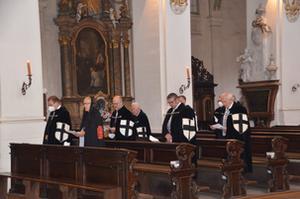 Der Deutsche Orden wählte sich, nach dem Vorbild der Kreuzfahrenden, das Kreuz zum Ordenszeichen. Er feiert daher das Hochfest Kreuzerhö- hung als Titelfest. Bereits in den ältesten Satzungen des Ordens aus dem 13. Jahrhundert werden die Brüder dazu angehalten, ein vorbildli- ches Leben zu führen, „da sie das Zeichen der Liebe und des Ordens in der Gestalt des Kreuzes tragen, um damit zu erweisen, dass Gott mit ihnen und in ihnen sei“. Das Fest Kreuzerhöhung, gleichsam der Namenstag unserer Gemeinschaft, begingen die Familiaren der Komturei „An Rhein und Main“ in Deutschorden in Frankfurt-Sachsenhausen am 12. September 2021 mit einem Konveniat. Dem Hochamt in der Deutschordenskirche stand Pater Jörg Weinbach OT, der Geistliche Assistent der Komturei, vor und spendete den Segen mit der Sachsenhausener Monstranz, die als besonderen Schatz ein Partikel des Heiligen Kreuzes birgt. In seiner Predigt erinnerte Pater Jörg daran, dass ein Christentum ohne Kreuz weltlich ist und unfruchtbar wird. Das Kreuz dürfe nicht zum Symbol reduziert oder für politische Zwecke missbraucht werden, man müsse auch nach den Werten des christlichen Glaubens leben.