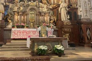 Im Innenhof des Deutschen Hauses in Wien wurde mit einem Pontifikalamt das Hochfest des Leibes und Blutes Christi, Fronleichnam, mit S.E. Gen. Abt. Frank Bayard, Hochmeister des Deutschen Ordens, gefeiert. Wie im vergangenen Jahr unter Teilnahme von zahlreichen Vertretern des Souveränen Malteser-Ritter Ordens, des Ritterordens vom Heiligen Grab zu Jerusalem sowie der Familiaren der Ballei Österreich des Deutschen Ordens. Das Fest wurde erstmals 1246 im Bistum Lüttich in der Basilika St. Martin gefeiert und 1264 von Papst Urban IV. zum Fest für die Gesamtkirche erhoben. Die Anregung zur Schaffung dieses Festes geht auf eine Vision der heiligen Juliana von Lüttich, einer Augustinerchorfrau, im Jahre 1209 zurück, in der ihr Christus erklärt hat, dass ein Fest des Altarsakraments im Kirchenjahr fehlt und sodann vom Papst in den liturgischen Kalender der Gesamtkirche aufgenommen wurde.
